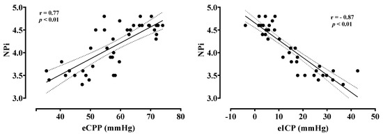 Correlation between estimated cerebral perfusion pressure (eCPP) and estimated intracranial pressure (eICP) with the Neurological Pupil Index (NPi).
