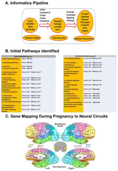 Informatics Pipeline and Mapping of Genes to Neural Circuits: (A) Schemati representation of the informatic pipeline analysis (B) 2631 neurodevelopmental genes, including 594 from pathogenic CNVs of autism subjects, were analyzed via KEGG and Panther pathway analysesProminent signaling pathways which use MAPK, RAS, and tyrosine receptor kinases were common to both analyses. (C) After protein–protein interactions were evaluated via String and mRNA Co-expression analyses, 121 genes were mapped for their antenatal/postnatal expression in Research Domain Criteria (RDoC)-defined neural circuits using Brodmann areas.
