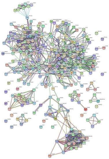 The set of genes derived from the protein–protein interactions were also analyzed for their mRNA co-expression in the quantile of the Brain Development-Normal Gene Expression (Yale/Sestan) dataset group, using GeneNetwork.org (accessed on 1 January 2019) [33]. The Graph tool was used to generate a correlation graph from the selected traits with a Pearson’s correlation of greater than 0.7 or less than −0.7. GeneNetwork.org (accessed on 1 January 2019) is a free online analytic tool and data reservoir that aids in the integration of largely varied sets of genetic and phenotypic data. It helps to provide an integrated view of genetic and phenotypic data sets [33].