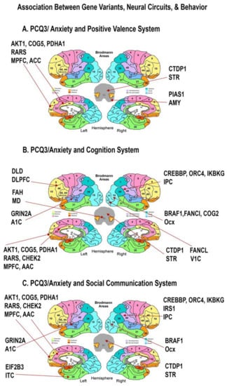 Neural Mapping of the Genes Associated with Parental Questionnaire Anxiety Scores. Map of the peak antenatal expression of genes in RDoC neural-derived circuits (as defined by NIMH) and elevated reported levels of PCQ3 anxiety scores. As expected, significantly associated genes are expressed in the Positive Valence (Reward), Cognition, and Social Communication circuits (Table 2). Furthermore, the expression was restricted to a set of Brodmann areas mediating known ASD relevant circuits involving cellular metabolism, neurotrophic, and neuroinflammatory pathways. ACC Anterior Cingulate Cortex, Amy Amygdala, STR striatum, OCx occipital cortex, DLPFC dorsolateral prefrontal cortex, MD mediodorsal nucleus of thalamus, A1C primary auditory cortex, IPC inferior parietal cortex, STR striatum, V1C primary visual cortex (area V1/17), ITC inferolateral temporal cortex (area 20), VLPFC ventrolateral prefrontal cortex.