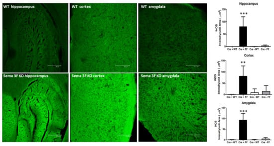 iNOS Expression in Sema 3F KO Mice. Left panel: iNOS immunofluorescence in hippocampus, cortex, and amygdala of Sema 3F KO mice and their wild type (WT) littermate showed significantly increased iNOS expression in Sema 3F KO tissue. Right panel: quantification of iNOS immunofluorescence showed significantly higher fluorescence/unit area in the hippocampus, cortex, and amygdala of Sema 3F KO mice compared to all three control mice; *** p ≤ 0.0001; ** p ≤ 0.001; n = 5.