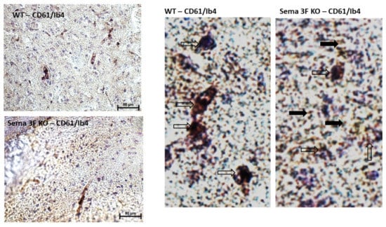 Localization of Platelets in Sema 3F KO vs. Wild Type Mice. Left panel: Representative immunohistochemical staining of platelet (CD61; brown), vascular (Ib4; purple), with blue hematoxylin counterstain, in brain cortex from Sema 3F KO mice and their littermate wild type (WT) mice. The higher magnification of pictures shown in left panel indicate CD61 immunostaining mostly colocalizing with IB4 in WT mice. In contrast, Sema 3F KO tissue showed CD61 immunoreactivity partly colocalizing with IB4 (clear arrows) and partly out of IB4 (black arrows). The results show a significant increase in platelet infiltration in Sema 3F KO mice compared to more localized vascular platelet staining in the control WT mice.