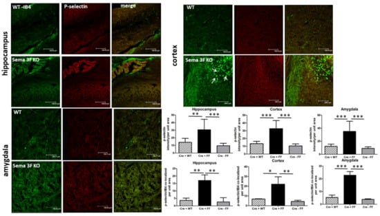 Immunofluorescence staining for p-selectin (red), an adhesion molecule expressed at the surface of activated platelets and mediating their adhesion to endothelial cells and neutrophils, showed significantly increased immunoreactivity in the hippocampus *** p ≤ 0.0001; ** p ≤ 0.001; n = 3–5), cortex (*** p ≤ 0.0001; n = 3–5) and amygdala (*** p ≤ 0.0001; n = 3–5) of Sema 3F KO mice (CRE+FF) when compared to their control mice (CRE + WT and CRE-FF) (Figure 9). Co-staining with IB4 (green), a lectin vascular stain that has also been shown to mark microglia, shows increased co-localization in all three brain areas (*** p ≤ 0.0001; ** p ≤ 0.001; * p ≤ 0.01; n = 3–5). Of note, IB4 staining revealed microglia without radial processes, and was therefore morphologically suggestive of activated microglia in Sema 3F KO t but not in WT cortex (Figure 9). These data strongly suggest increased platelet activation and confirm our observation of increased microglial activation, as shown in Figure 4, in Sema 3F KO mice brains compared to control animals.