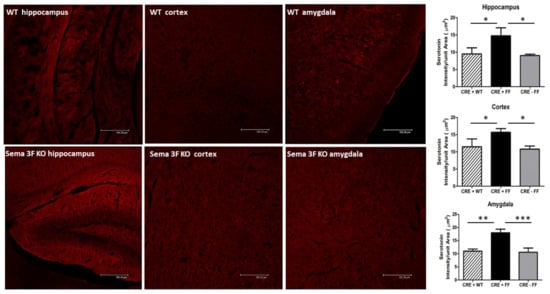 Platelets granule release upon activation is a major source of serotonin. Immunostaining of serotonin showed increased and widespread serotonin expression in all brain areas of Sema 3F KO mice compared to a less diffuse and less intense staining in WT animals. A quantitative assessment of serotonin expression in all three brain areas of Sema 3F KO mice (CRE+FF) showed a significant increase when compared to their control groups (CRE + WT and CRE-FF). The average serotonin staining intensity per unit area in the hippocampus, cortex, and amygdala was significantly higher than in the control groups (*** p ≤ 0.0001; ** p ≤ 0.001; * p ≤ 0.01; n = 3). (Figure 10). These findings suggest that activated platelets in Sema 3F KO mice brain may release their granule content and contribute to the increase in serotonin expression.