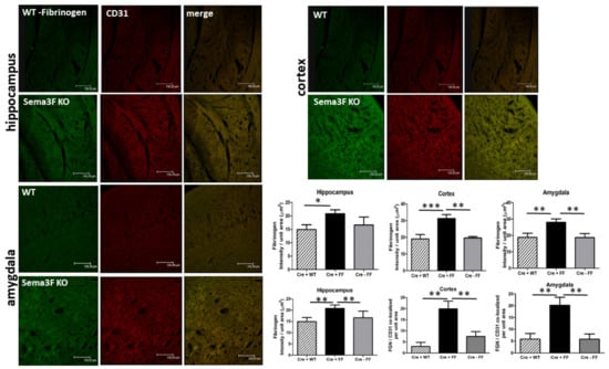 Fibrinogen is a glycoprotein that binds platelets αIIbβIII receptor, accumulating during tissue and vascular injury and promoting activated platelet aggregation and clot formation. An immunohistochemical analysis of Fibrinogen and CD31 (Platelet endothelial cell adhesion molecule, PECAM-1) immunoreactivity showed a significant increase of fibrinogen (green) accumulation and infiltration in the brain areas of Sema 3F KO mice (CRE+FF), with clear CD31 (red) co-localization when compared to their control groups (CRE + WT and CRE-FF) (Figure 11). While a trend of increased CD31 was noticeable in all three brain areas, it did not reach significance. Interestingly, CD31 (Figure 11) and P-selectin antibodies (Figure 9) produce little labeling of cerebral blood vessels in WT animals consistent with previous reports in adult mice [39,40]. The average Fibrinogen staining intensity per unit area in the hippocampus, cortex, and amygdala was significantly higher in the Sema 3F KO mice when compared to the control groups, (*** p ≤ 0.0001; ** p ≤ 0.001; * p ≤ 0.01; n = 3) (Figure 11). Quantifications of high magnification immunofluorescent merged images shows increased fibrinogen-CD31 co-localization in all three brain areas in Sema 3F KO mice compared to their controls (** p ≤ 0.001 CRE +FF vs. CRE + WT and CRE-FF) (Figure 11). These findings strongly suggest that increased platelet endothelial interaction could potentiate vascular inflammation and endothelial injury.