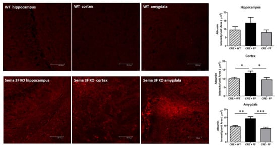 Inflammation and platelet–endothelial aggregation induce changes in vascular permeability, resulting in trans-vascular albumin leakage. Immunofluorescence analysis of albumin localization showed a significant increase in all three brain areas of Sema 3F KO mice (CRE + FF) when compared to their control groups (CRE + WT and CRE-FF). The staining was present throughout the brain areas and was especially noticeable in the hippocampus, cortex, and amygdala and in the subventricular zone. In some areas, staining appeared as individual cells (neuronal-like morphology), while in others, when cells clumped together, it had a patchy appearance, and in the subventricular zone, it was spread out throughout the ventricular space. The average albumin staining intensity per unit area in the hippocampus showed a clear trend of increased leakage in CRE + FF group but did not reach significance. The average albumin staining intensity per unit area in the cortex and amygdala was significantly higher in the Sema 3F KO mice when compared to the control groups *** p ≤ 0.0001; ** p ≤ 0.001; * p ≤ 0.01 (Figure 12). These results are strongly suggestive of vascular permeability changes that occur with BBB disruption.