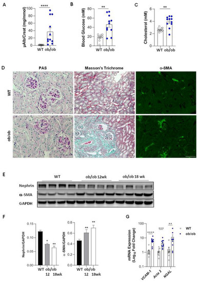 Renal function and structure in diabetic ob/ob mice. Microalbuminuria (µAlb)-creatinine ratio (A), blood glucose (B) and cholesterol (C), representative examples of Periodic Acid-Schiff (PAS), Masson’s trichrome coloration (×100), and α-SMA immunofluorescence staining (×200) (D), nephrin and α-SMA protein expressions by WB (E,F), and mRNA gene expressions of VCAM-1, Acta2, and N-GAL (G), in ob/ob mice. * p < 0.05, ** p < 0.01, *** p < 0.001, **** p < 0.0001 compared to WT controls. Bars = 50 µM (right) and 100 µM (middle, left). n = 10 WT mice vs. 11 ob/ob mice (A–D,G). In WB experiments, n = 4 mice per group, WT, and 12 weeks or 18 weeks old ob/ob mice (E,F).