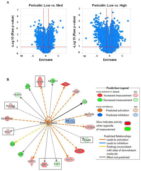 High periostin levels are associated with an activation of the NF-κB pathway. Volcano plots of differential gene regulation “low” versus “medium” and “low” versus “high” periostin expression. The log p-value for each gene is shown over the fold change in the expression (FKPM). The cut-off lines represent a p-value of 0.05 and a fold change of −2 or 2 (A). NF-κB mediated gene regulation (B).
