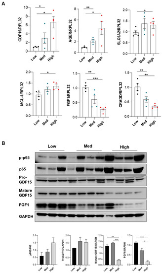 We next sought to identify the pathways that could trigger periostin expression during DN. Given the heterogeneity observed between animals with respect to the severity of renal lesions and periostin expression, we decided to divide the mice into 3 subgroups based on microalbuminuria levels (which correlated with renal nephrin protein expression levels of periostin, as described in Figure 2C: “low” periostin expression <1 mg/mmol microalbuminuria” corresponding to the WT mice, “medium” periostin expression with <20 mg/mmol microalbuminuria and “high” periostin expression >20 mg/mmol of microalbuminuria” corresponding to ob/ob mice with mild and severe renal injury, respectively. We performed this type of classification because our purpose was to identify genes that play a role in the development of DN and are associated with periostin. A comparison between the samples from WT “low” versus ob/ob “medium” and WT “low” versus ob/ob “high” periostin expression revealed approximately 440 and 778 genes differentially regulated (DEG) with a corrected p-value below p(FDR) < 0.05 (FDR: false discovery rate). The gene expression differences between low vs. high were stronger than with low vs. medium (Figure 3A). This analysis allowed us to identify more than 6 pathways, with a significant activation or inhibition score and a significant corrected p-value. Thus, activation of pro-inflammatory (NF-κB, MAPK14, IL-33), anti-apoptotic (AKT1, NOTCH2) and pro-fibrotic (HSF1, AGT) signalling pathways were increased in “high” periostin diabetic mice (Table S1). We focused on the NF-κB pathway since we and other investigators have previously demonstrated that NF-κB activation promotes periostin expression in glomerulonephritis and also in a model of pulmonary fibrosis, respectively described [20,23]. Moreover, we found twenty-four genes whose variation in expression was found to be positively or negatively correlated with differences in periostin expression (Table S2). From this list, we first excluded genes whose expression is known to be associated with obesity, such as genes of carbohydrate (carboxylesterase 1G) or lipid metabolism (apoliprotein H, lipoprotein lipase), and selected six genes which are associated to the NF-κB pathway: fibroblast growth factor 1 (FGF1), growth differentiation factor 15 (GDF15), advanced glycation end products receptor (AGER), death domain-containing protein (CRADD), sodium–glucose cotransporters (SCL5A2) and myeloid leukaemia cell differentiation protein (MCL-1) (Figure 3B).