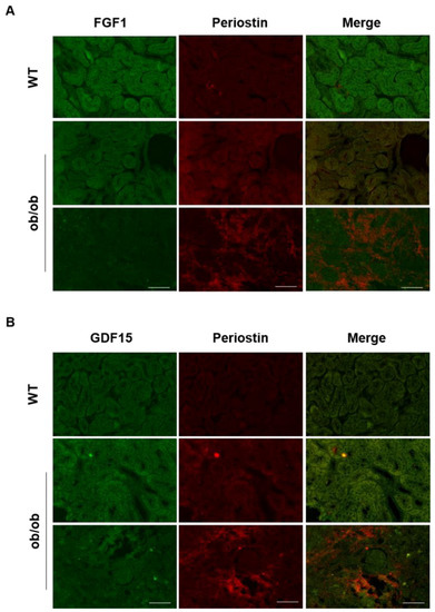 The differential expression of genes identified by RNAseq analysis (Figure S3) was confirmed by qPCR (Figure 4A). In particular, increased expression of GDF15, AGER, SCL5A2 and MCL-1 was observed in mice with increased expression of periostin. Conversely, lower expression of FGF1 and CRADD was associated with increased periostin expression. Other genes, including SCL5A2, MCL-1 and CRADD, were regulated by NF-κB independently of periostin variation, suggesting that these genes although mediated by the NF-κB pathway and associated with DN are not systematically associated with periostin. SCL5A2 also known as SGLT2, plays an important role in tubular apoptosis and reactive oxygen generation in DN [24]. MCL1 and CRADD both are involved in apoptosis and NF-κB signalling [25,26,27,28]. The involvement of AGER was confirmed by bioinformatics and validated by qPCR. Indeed, AGER activation promotes cell dysfunction and the release of pro-inflammatory cytokines by activating nuclear NF-κB [29]. To further validate the role of the NF-κB pathway in the ob/ob model, we evaluated the expression of the identified targets from kidney extracts of the same mice used for the RNAseq analysis (Figure 4B). NF-κB activation was studied by assessing the levels of p65 phosphorylation, one of the most abundant forms present in most cell types. Increased p65 levels were observed in ob/ob compared to WT mice. Furthermore, p65 phosphorylation was increased in mice with high periostin levels, suggesting a correlation between periostin and p65 activation. One sample from the group “high periostin” was removed for the analysis because of the low protein expression of our loading control GAPDH. An opposite trend was observed for FGF1 expression whose levels were decreased and inversely correlated with periostin expression in ob/ob compared to WT mice. In WT mice, FGF1 immunostaining was mainly found in tubule cells (Figure 5A). In contrast, FGF1 staining was decreased in ob/ob mice displaying moderate periostin expression, and was almost absent in ob/ob mice with high periostin expression, particularly in the areas of fibrosis where periostin predominates (Figure 5A). A similar trend was observed for the mature form of GDF15 whose protein expression was inversely associated with periostin levels, whereas the inactive form pro-GDF15 and its related mRNA were increased (Figure 4A,B). By immunostaining, GDF15 localisation seemed also to be dependent on the presence or absence of periostin (Figure 5B). GDF15 expression was tubular, cytoplasmic and diffuse in samples with low levels of periostin. Conversely, in fibrotic areas where periostin is strongly induced, GDF15 was weakly detected or even absent (Figure 5B). Thus, when periostin is highly expressed both FGF1 and GDF15 are undetectable, whereas tubular areas with intermediate periostin expression presented simultaneously expression with FGF1 or GDF15. These data suggest that periostin in DN might repress the expression of FGF1 and prevent GDF15 activation, favouring in this way the establishment of renal fibrosis.