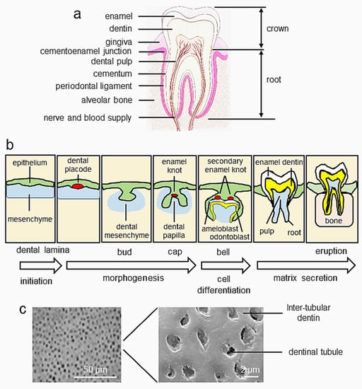 The tooth is an amazing sensory organ. Teeth perform basic physiological functions in our daily life, playing essential roles in mastication and speech. The tooth is composed of enamel, dental pulp, dentin, and periodontium, consisting of cementum, the periodontal ligament (PDL), alveolar bone, and gingival tissue (Figure 1a) [,]. Tooth development and formation are characterized as resulting from sequential and reciprocal interactions between dental oral epithelial and ectomesenchymal cells. The mouse is widely used as an animal model for studying tooth development and signaling pathways. At embryonic day 10 (E10) of mouse tooth development, oral epithelial cells invade, interact with mesenchymal cells, and initiate the mesenchyme directing the process. At E11.5, a local thickening of the dental epithelium becomes evident as the presumptive dental epithelial cells elongate along the apical–basal axis and cell shape changes from cuboidal to columnar, forming the dental placode (the lamina stage) (Figure 1b). At E12.5, the thickened dental epithelial cells derived from the ectoderm of the first branchial arch proliferate and invaginate into the subjacent ectomesenchyme of the neural crest and continue until E13.5, forming a definite tooth bud (the bud stage). The tooth bud is organized into three major parts, including the enamel (dental) organ, the dental papilla, and the dental follicle. Subsequently, the epithelial bud progresses to the cap stage at E14.5 (the cap stage) and goes through specific folding, with enamel knot formation in the dental epithelium to control the patterning of tooth cusps. A small group of ectomesenchymal cells below the dental epithelium proliferate and produce extracellular substances, resulting in an aggregation of these cells termed the dental papilla. On the other hand, ectomesenchymal cells surrounding the enamel organ become dense and form what is known as the dental follicle. Eventually, the epithelial cells from the enamel organ differentiate into ameloblasts, which produce enamel, while mesenchymal cells from the dental papilla differentiate into odontoblasts and produce dentin and dental pulp. The dental follicle produces all the supporting structures of the tooth, such as cementum, alveolar bone, and PDL. When the dental epithelial and mesenchymal cells proceed to histodifferentiation and morpho-differentiation and the enamel organ forms a bell-shaped morphology at E16.5 (the bell stage), these cells begin to differentiate into ameloblasts and odontoblasts, respectively []. During the late bell stage of tooth development, odontoblasts synthesize and produce dentin extracellular matrix (ECM), including collagen and non-collagenous proteins (NCPs) required for dentin formation.