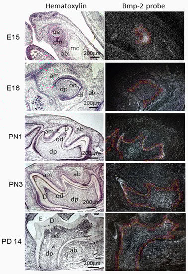 During the initiation stage of tooth development (E10–E12), the Bmp-6 transcript is not detectable, but at the bud and cap stages Bmp-6 expression is weakly observed in dental mesenchyme, dental lamina, and enamel-organ epithelial cells [,]. During the bell stage, Bmp-6 protein reaction in developing odontoblasts and dental papilla can be found to be positive using anti-Bmp-6 immunostaining. Bmp-6 immunoreactivity is weakly present in the outer enamel epithelium and stratum intermedium but is not visible by developing ameloblasts. The dental lamina continues to react positively and the dental follicle negatively. When dentin matrix production begins, polarized odontoblasts appear strongly Bmp-6-immunoreactive. Positive staining with Bmp-6 antibody is also observed in the dental pulp. Expression of Bmp-6 persists in secretory odontoblasts during the period of dentin formation, whereas enamel organ epithelial, secretory ameloblasts, and dental follicles react negatively []. On PNs, Bmp-6 protein is present in mesenchymal cells in the freshly formed periodontium and in the layer of cementoblasts along with the root, the HERS, as well as in the osteoblasts lining the alveolar bones [].