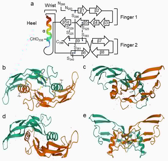Classically portrayed as a hand, each chain consists of two sets of anti-parallel β-strands forming finger-like extensions that protrude from a central stabilizing “wrist” α-helix. The structure is stabilized by a conserved cystine knot formed by three internal disulfide bonds, similar to other growth factors [] (Figure 4). Crystal structures of BMP homodimers revealed that the core structures of BMP dimers consist of a “cystine knot” structure and that the overall structure of BMPs has a “wrist and knuckle” or “two bananas” shape [,,,,]. Studies of the crystal structures of BMPs have also identified possible binding epitopes of BMPs to specific receptors and antagonists [,,,,,,,,] (Figure 5).