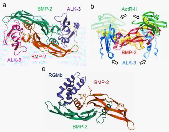 Ligand binding induces the formation of hetero-tetrameric receptor complexes consisting of the type I and type II receptors [,]. Tight regulation of signaling intensity, duration, specificity, and diversity is further achieved by the interaction of this receptor complex with co-receptors, e.g., endoglin, betaglycan, repulsive guidance molecules (RGMs, including RGMa, RGMb or DRAGON, and RGMc or Hemojuvelin), neogenin, TrkC, ROR2, MuSK, neuropilins, BAMBI, or integrins [,,]. Co-receptors do not produce a signal directly, but rather promote ligand docking on the cell surface, regulating specificity and likely controlling signaling kinetics [,]. Recent reviews have highlighted aspects of co-receptor biology and have been linked to BMP signaling modulation [].