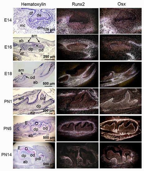 Runx2 and Osx expression patterns in developing teeth. Runx2 mRNA was clearly detected in dental and osteogenic mesenchyme from E14 to E16. Its expression was intense in osteogenic mesenchymal cells, whereas expression was downregulated in odontoblasts, ameloblasts, and dental pulp cells at E18 of the mandibular incisor and first molar. At this stage, Osx expression mostly overlapped with Runx2 expression from E14–E16. At E18, its expression was prominent in ameloblasts, odontoblasts, and dental pulp cells. From PN 1 to PN 14, Runx2 mRNA was detected in osteogenic mesenchyme and remarkedly downregulated in ameloblasts, odontoblasts, and dental pulp cells. In contrast, Osx expression continued to be present in osteogenic mesenchyme, odontoblasts, dental pulp cells, and periodontal ligament cells. ab, alveolar bone; am, ameloblasts; D, dentin; de, dental epithelium; df, dental follicle; dp, dental papilla; E, enamel; E, embryonic day; mc, mesenchymal condensates; od, odontoblasts; pdl, periodontal ligament cells. PN, postnatal day. Photos are partially adapted with permission from Chen et al., 2009, ref. [].