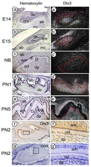 Expression of Dlx3 during mouse tooth development. (a–e). Bright images. (a’–e’) In situ hybridization for Dlx3 expression during mouse tooth formation. At the cap stage (E14–E15), the anti-Dlx3 probe is strongly present in the dental mesenchyme and osteogenetic mesenchyme developing alveolar bone and is moderately visible in the dental epithelium and Meckel’s cartilage. At new birth (NB) and PNs 1 and 5, expression of Dlx3 can be detected in ameloblasts, odontoblasts, dental papilla, and dental follicles, as well as in the mesenchyme in the alveolar bone. At PN 1, Dlx3 expression is more intense in ameloblasts, odontoblasts, and dental papilla than in developing alveolar bone mesenchymal cells. (f,f’). Tooth tissues were immunostained with anti-Dlx3 antibody, showing that the Dlx3 expression is apparent in ameloblasts, dental pulp cells, and odontoblasts at PN 2 of mouse tooth development. (f’) shows higher a magnification of the box in (f). The tissue sections were stained with anti-IgG serum as the negative control. (g’) shows a higher magnification of the box in (g). ab, alveolar bone; am, ameloblasts; con, control; D, dentin; de, dental epithelium; dm, dental mesenchyme; df, dental follicle; dp, dental papilla; E, enamel; E, embryonic day; mc, Meckel’s cartilage; od, odontoblasts; PN, postnatal day. The data are unpublished.