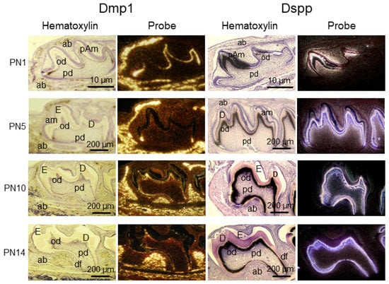 Dmp1 and Dspp expression patterns in developing teeth. By in situ hybridization assay, Dmp1 mRNA transcription was clearly detected in odontoblasts near the dental crown and root of the mouse tooth and osteoblasts in alveolar bones by PN 1, while by PN 5, Dmp1 expression was downregulated in odontoblasts and only appeared in odontoblasts located at the dental root but was highly intense in the alveolar bone. By PN 10–14, Dmp1 transcription was weakly visible in odontoblasts, but still highly expressed in osteoblasts in alveolar bones. By PN 1, Dspp transcripts were evident in odontoblasts, dental papilla, and pre-ameloblasts in the mouse mandibular molars. By PN 5, Dspp mRNA was strongly expressed in odontoblasts and weakly seen in ameloblasts and dental pulp cells. From PN 10 to 14, Dspp mRNA was mainly expressed in odontoblasts and weakly in dental pulp cells. Dspp expression was barely detected in osteoblasts in alveolar bone from PN 1 to PN 14 during mouse tooth development. ab, alveolar bone; am, ameloblasts; D, dentin; df, dental follicle; dp, dental papilla; E, enamel; od, odontoblasts; mc, Meckel’s cartilage; pAm, pre-ameloblasts; pd, dental pulp; PN, postnatal day. The photos are partially adapted with permission from Chen et al., 2009, ref. [].