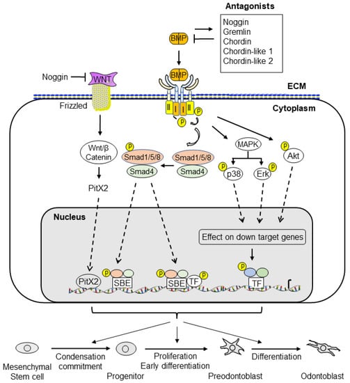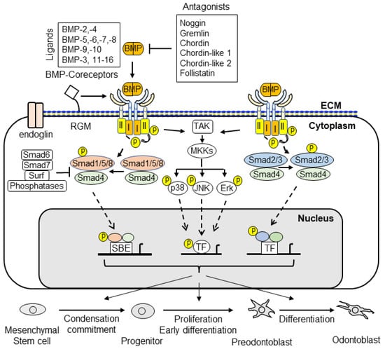 The molecular regulation of tooth development and morphogenesis leading to dentin formation has been studied. Indeed, a lot of work has shown that the network controlling dentin development encompasses the action of numerous signaling pathways, including growth factors, transcriptional factors, and other components, which execute various stages of tooth development and formation [,,]. However, the systematic molecular network of bone morphogenetic proteins (BMPs) and their antagonists controlling the early and late stages of dentin development and formation has not been described in detail. In this review, we explore some of the unique transcriptional regulatory and signaling networks involving BMPs and their antagonists, as well as accurate balances of BMPs and their antagonists during dentinogenesis that may play critical roles in regulating dentin formation and regeneration. Based on recent advances in our understanding of how these networks function during tooth morphogenesis, we review what is currently known about the cellular and molecular mechanisms involved in the formation of dentin and the potential implication of progenitor-/stem cell-mediated dentin development and regeneration, as well as their relevance in human diseases. Finally, we suggest future directions for investigating the molecular and cellular regulatory mechanism of dentin development and regeneration.