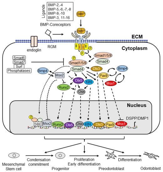 MSXs are homeobox genes and constitute a large family of transcription factors. Mutations of MSX genes result in cleft lip, cleft palate, and tooth agenesis. Patients with MSX1 mutations exhibited teeth with oligodontia [,]. Mutations of MSX1 in humans and mice cause tooth deficiency [,,,]. BMP–Smad signals induced tooth development via MSX1. MSX1 induced human DPSC proliferation and differentiation as well as expression of BSP and DSPP genes in human DPSCs [,]. However, Feng et al. reported that MSX1 promotes proliferation and prevents the differentiation of dental mesenchymal cells by the inhibition of BMP-2 and BMP-4 expression and downregulation of DSPP, DMP1, Runx2, OC, and Collα1 gene expression [,]. Of note, an atypical canonical BMP signaling pathway in a Smad1/5/8-dependent, but Smad4-independent manner in the dental mesenchyme during odontogenesis upregulated Msx1 expression via binding of pSmad1/5/8 proteins in Msx1 gene promoter [,].