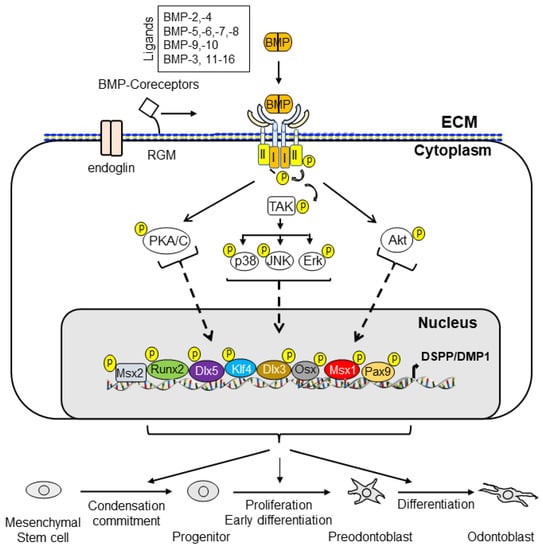 Smad-independent signaling pathways. BMP signal transduction involves a number of ligands, type I and type II serine/threonine kinase receptors and coreceptors, which regulate the activation of intracellular mediators in interactions with extracellular stimuli. Smad-independent signaling through phosphorylated TAK (pTAK), protein kinases A and C (PKA/C), and PI3K/Akt. Ligand binding induces the formation of the receptor complex. BMP receptors linked to the TAK1/TAB1 phosphorylate and activate the downstream MAPKs, including p38, ERK1/2, and JNK, respectively. Consequently, activation of these kinases leads to the phosphorylation of several transcriptional factors, activating the transcription of downstream target genes. In addition, PI3K/Akt and PKA/C are phosphorylated by BMP receptors. Then activated PI3K/Akt and PKA/C phosphorylate their downstream transcription factors. These activated transcription factors bind to their binding responsible elements in their target gene regulatory regions and upregulate the expression of DSPP and DMP1 genes and induce dental mesenchymal cell differentiation and dentin formation. Akt, (v-Akt murine thymoma viral oncogene)/PKB (protein kinase B); ERKs, extracellular signal-regulated kinases; JNKs, c-Jun NH2-terminal kinases; PI3K, phosphoinositol 3-Kinase; PKA, protein kinase A; PKC, protein kinase C. The figure is partially adapted with permission from Wu et al., 2016, ref. [].