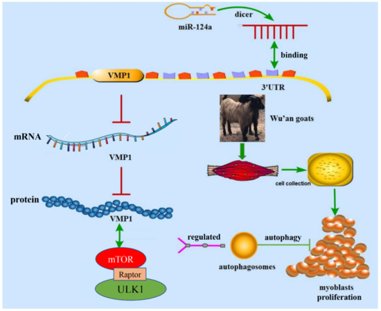 Liu Y, Zhou Z, Li K, Wang P, Chen Y, Deng S, Li W, Yu K, Wang K. VMP1 Regulated by chi-miR-124a Effects Goat Myoblast Proliferation, Autophagy, and Apoptosis through the PI3K/ULK1/mTOR Signaling Pathway. Cells. 2022; 11(14):2227. https://doi.org/10.3390/cells11142227