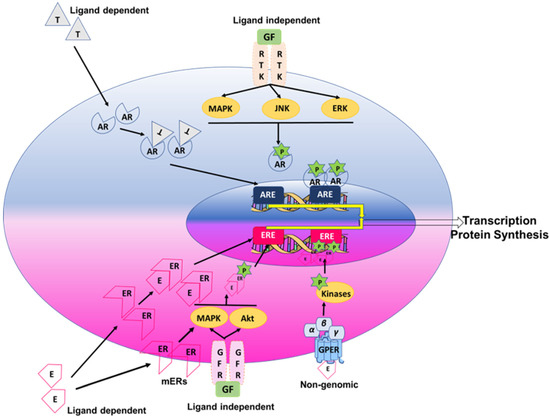 Schematic diagram illustrating the intracellular genomic (ligand-dependent and -independent) and non-genomic pathways of estrogen and testosterone. The genomic effects of sex steroids occur through their binding to cytoplasmic or membrane steroid receptors or through direct phosphorylation of other coregulators. Genomic signaling is a classic mechanism of action where phosphorylated hormone receptor complexes translocate to the nucleus and further bind to steroid receptor elements in the promoter regions of the target genes. Indirect genomic effects occur when sex steroids regulate gene expression by regulating other transcription factors or kinases. Abbreviations: E, estrogen; T, testosterone; AR, androgen receptor; ER, estrogen receptor; mER, membrane estrogen receptor; RTK, Receptor tyrosine kinases; GF, Growth Factors; ARE, androgen response elements; ERE, estrogen response elements; GFR, Growth factor receptor; GPER, G-protein estrogen receptor 30.