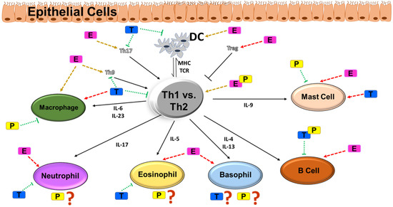 Th1 vs. Th2 type of inflammation and their effects in immune cells: modulatory role of sex steroids. Several studies have postulated a Th1 vs. Th2 driven hypothesis of airway inflammation and the critical role of immune cell types such as macrophages, neutrophils, eosinophils, basophils, B cells and mast cells. The normal functioning of these immune cell types is affected by circulating concentrations of estrogen vs. testosterone vs. progesterone, the effect influenced by the cyclical variations of the sex steroids. Pathways aggravated during asthma are marked by red arrows (dotted), whereas pathways inhibiting airway inflammation in asthma are marked by green arrows (dotted). Yellow arrows denote unknown effects. Abbreviations: DC, dendritic cells; MHC, major histocompatibility complex; TCR, T-cell receptor; IL, interleukin; E, estrogen; T, testosterone; P, progesterone.