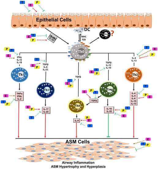 It is well known that asthma is a multifaceted respiratory disorder consisting of allergic triggers on the immune system and alterations in the structural cells of the airway. Overall, airway inflammation is mainly orchestrated by the T cell subsets, and the regulation of T cell subsets from naïve (Th0) cells may regulate cytokine release towards specific T-cell types. These T cells and their cytokine release are influenced by sex steroids such as estrogen, testosterone and progesterone. All these T cell subsets play key roles in recruiting, activating, and promoting the survival of multiple cell types along with altered pro- and anti-inflammatory cytokines in the airways, subsequently leading to airway smooth muscle cell (ASM) inflammation and remodeling. This is greatly influenced by circulating sex steroids, as discussed in this review. Pathways/cytokines aggravated in asthma are marked with red arrows (single and dotted), whereas pathways inhibiting airway inflammation in asthma are marked with green arrows (single and dotted). Yellow arrows denote unknown effects. Abbreviations: DC, dendritic cells; MHC, major histocompatibility complex; TCR, T-cell receptor; Th0, T helper cell (naïve); IFNϒ, interferon-gamma; IL, interleukin; TGF-β, transforming growth factor-beta; TNFα, tumor necrosis factor-alpha; E, estrogen; T, testosterone; P, progesterone.