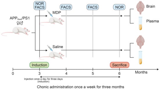 Timeline of the experimental design and methods following MDP (10 mg/kg) or saline (0.9%) administration in male or female wild-type and APPSwe/PS1 treated or not with MDP from 3 to 6 months old. Mice were injected once a day for three days (induction) followed by one injection a week for three months. At 6 months, the mice were sacrificed, and their brains and the plasma were extracted for further analysis.