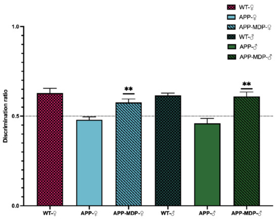 MDP has a powerful impact on the short-term memory of APP mice. Novel object recognition tasks with 2-time-point comparison of male or female WT and APPSwe/PS1 from 3 to 6 months. Discrimination differs from 0.5. Data are mean ± SEM (n = 8 animals/group). ** p < 0.01 compared to sex-matched APPSwe/PS1 controls.