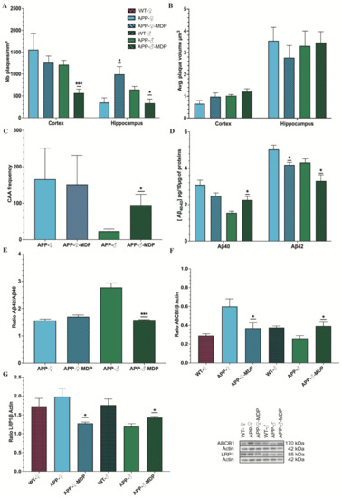 Amyloid has an important role in AD pathology since it is thought to be the main cause of the disease. To evaluate whether the MDP has an impact on the amyloid load, we quantified different parameters such as the volume and the number of amyloid plaques, the amount of blood vessels positive for amyloid, and the concentration of Aβ42 and Aβ40 in the brain.