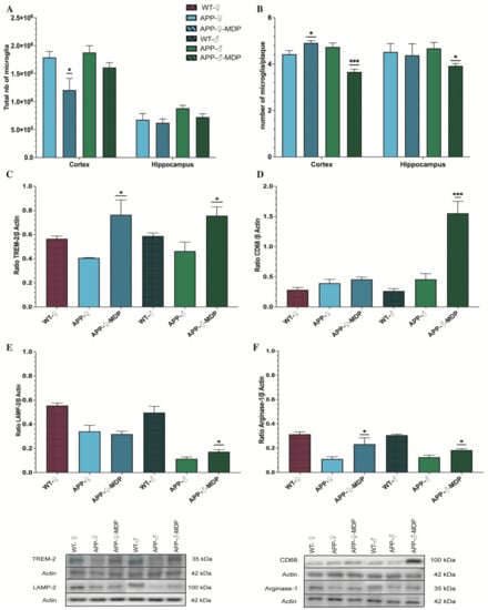 Microglia play an important role in defending the brain against aggressor and toxic molecules. To study the impact of MDP on microglia, we quantified the total number of microglia and the number of microglia per plaque using the same stereology software and we used Western blotting to evaluate the phagocytic response of microglia.