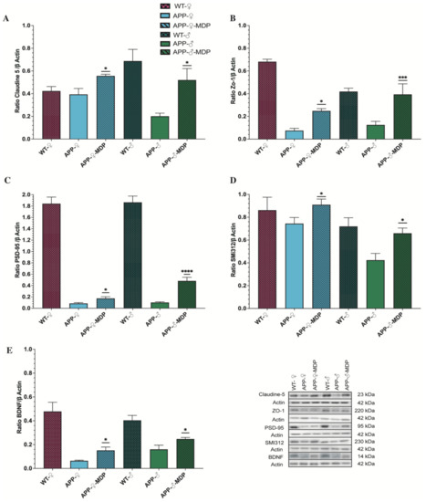 MDP prevents BBB degradation in males and females with conservation of pre- and postsynaptic factor. Western blot analysis of (A) Claudin-V, (B) ZO-1, (C) PSD-95, (D) SMI312, and (E) BDNF of the male or female wild-type and APPSwe/PS1 treatment or not with MDP groups. Data are mean ± SEM (n = 8 animals/group). * p < 0.05, *** p < 0.001, **** p < 0.0001 compared to sex-matched APPSwe/PS1 controls.
