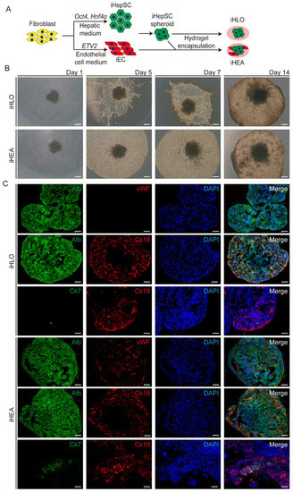 Generation of liver assembloid using induced hepatic stem cells (iHepSCs) and induced endothelial cells (iECs). (A) Schematic illustration of generating liver assembloids by encapsulating iHepSCs and iECs in Matrigel and type I collagen hydrogel. iHepSCs were obtained by direct conversion of fibroblasts using transcription factors, Oct4 and Hnf4α, and iECs were obtained by direct conversion of fibroblasts using transcription factor ETV2 (liver organoid generated with iHepSC spheroid encapsulated in hydrogel = iHLO; liver assembloid generated with iHepSC spheroid encapsulated in hydrogel that contains iEC = iHEA). (B) Microscopic images of the morphology of iHLOs and iHEAs from days 1 to 14 (scale bar: 250 μm). (C) Immunofluorescence images of iHLOs or iHEAs stained with hepatic lineage markers (Alb and Ck19), endothelial cell lineage markers (vWF), and cholangiocyte lineage markers (Ck19 and Ck7). The cells were counterstained with DAPI. Scale bar: 50 μm.