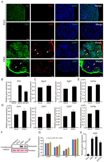 Gene expression of cell–ECM and cell–cell signaling-related genes, as well as hepatic-specification genes associated with FN1 expression of iHLOs and iHEAs. (A) Immunofluorescence images of iHLOs and iHEAs stained with FN1, Alb and vWF. The cells were counterstained with DAPI. Scale bar: 50 μm. White arrows indicate FN1-stained area. (B) qPCR analysis of FN1 expression in iHLOs and iHEAs relative to HF1. The transcriptional levels were normalized to the housekeeping gene (GAPDH). Error bars indicate standard errors from triplicate samples (n = 3). (C) qPCR analysis of cell–ECM signaling-related gene (ItgαV and Itgβ1) (D) and cell–cell signaling-related gene (Ocln, Cdh1 and Cdh2) expression in iHLOs and iHEAs relative to MEFs. The transcriptional levels were normalized to the housekeeping gene (Gapdh). Error bars indicate standard errors from triplicate samples (n = 3). (E) qPCR analysis of hepatic-specification gene (Hnf1α and Hnf4α) expression in iHLOs and iHEAs relative to MEFs. The transcriptional levels were normalized to the housekeeping gene (Gapdh). Error bars indicate standard errors from triplicate samples (n = 3). (F) Fibronectin protein expression analysis of medium-only and conditioned media from iHLOs, iHEAs, and iHEAs treated with 10 μM SR11302 (iHEAs–SR). Ponceau S staining was used as loading control. (G) qPCR analysis of hepatic-specification gene (Hnf4α and Hnf1α) and hepatic maturation gene (Alb and Ttr) expression in iHLOs, iHEAs–SR, and iHEAs relative to MEFs. The transcriptional levels were normalized to the housekeeping gene (Gapdh). (H) qPCR analysis of hepatocyte growth factor (HGF) expression level in iHLOs, iHEAs, iECs and HUVECs relative to HF1. The transcriptional levels were normalized to the housekeeping gene (GAPDH). Error bars indicate standard errors from triplicate samples (n = 3). * p < 0.05, ** p < 0.005.