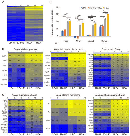 Gene expression of cell–ECM, cell–cell signaling-related genes, and hepatic-specification genes associated with FN1 expression of iHLOs and iHEAs. (A) Heatmap of differentially upregulated gene profiles in 2D-iHs, 2D-iHEs, iHLOs, and iHEAs as determined by RNA-seq. The Heatmap represents differentially expressed genes between 2D-iHs, 2D-iHEs, iHLOs, and iHEAs depending on the culture method (2D vs. 3D). The color bar codifies the gene expression in log2 scale. Yellow indicates upregulated genes, and blue indicates downregulated genes. (B) Heatmaps of differentially upregulated genes classified in three GO functional categories: “drug metabolic process,” “xenobiotic metabolic process,” and “response to drugs”. The color bar codifies the gene expression in log2 scale. Yellow indicates upregulated genes, and blue indicates downregulated genes. (C) Heatmaps of differentially upregulated genes classified in three GO functional categories: “apical plasma membrane,” “basal plasma membrane,” and “basolateral plasma membrane”. The color bar codifies the gene expression in log2 scale. Yellow indicates upregulated genes, and blue indicates downregulated genes. (D) qPCR analysis of selected highly expressed genes in iHEAs and iHLOs relative to MEFs. The transcriptional levels were normalized to the housekeeping gene (Gapdh). Error bars indicate standard errors from triplicate samples (n = 3). * p < 0.05, ** p < 0.005, *** p < 0.0005, n.s. = not significant.