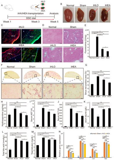 Six-week-old female C57BL/6J mice, purchased from Hyochang Science (Daegu, Korea), were housed in a 12 h light/dark cycle with free access to water and food. The experimental procedures were carried out in accordance with the approved guidelines; all animal experimental procedures were approved and conducted under protocol (UNISTIACUC-20-49) by the Animal Care and Use Committee of Ulsan National Institute of Science and Technology (UNIST, Ulsan, Korea). For the cholestatic liver fibrosis model, 8-week-old female C57BL/6J mice (n = 108) were fed with a standard chow diet supplemented with 0.1% (w/w) 3,5-diethoxycarbonyl-1,4-dihydrocollidine (DDC, Sigma-aldrich, St. Louis, MO, USA) for 4 weeks, as previously described [5,33]. Control mice were fed with standard rodent chow diet. iHLOs or iHEAs were transplanted in the kidney subcapsular area under anesthesia as described in previous study [34]. Briefly, 0.2 cm incision on the kidney subcapsular area across the anterior surface of the kidney was made using micro-scissors. Using glass rods, a kidney pouch was made between the kidney subcapsular and parenchyma. Two structures of iHLOs or iHEAs were slowly slid into the kidney pouch using glass rods, and the kidney was gently pushed back into the peritoneal cavity (Video S1). Hydrogel without cell transplantation was used as a sham group. At the end of the experiment period, all mice were sacrificed using the CO2 euthanasia method. Serum plasma was collected from each mouse and stored at −80 °C. Liver tissues from each mouse were excised and immediately snap-frozen in liquid nitrogen for further experiments. A portion of the fresh liver was preserved in 4% PFA for histopathological analysis.