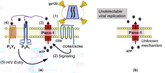 - Orellana, J.A.; Velasquez, S.; Williams, D.W.; Sáez, J.C.; Berman, J.W.; Eugenin, E.A. Pannexin1 hemichannels are critical for HIV infection of human primary CD4+ T lymphocytes. J. Leukoc. Biol. 2013, 94, 399–407. [Google Scholar] [CrossRef]