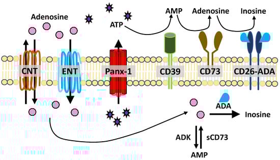 ATP release and metabolism. ATP is released through hemichannels, such as Panx-1. ATP (and ADP) are degraded into AMP by CD39. AMP is catabolized into adenosine by CD73. Adenosine is deaminated into inosine by adenosine deaminase (ADA), which is associated with CD26. Concentrative and equilibrated nucleoside transporters (CNT, ENT) facilitate nucleoside uptake and transport. Intracellular adenosine can be deaminated by ADA or converted to AMP by soluble adenosine kinase (ADK). Intracellular AMP is converted to adenosine by soluble CD73 (sCD73).