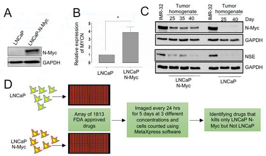 Identifying drugs with differential effects on the fitness of N-Myc overexpressing LNCaP cells. (A) Western blot showing N-MYC protein levels in the indicated isogenic cell lines. GAPDH is used as a loading control. (B) Expression levels of MYCN tested by RT-PCR in the isogenic cell lines (p < 0.05). (C) Western blots of LN-P and LN-Myc tumor homogenates at the indicated time points post cell implantation. Levels of N-MYC and NSE were assessed. (D) Schematic representing the pipeline of the high-throughput drug library screening in isogenic models. An array of FDA-approved drug libraries was used to identify those compounds that inhibit the growth of LNCaP-N-Myc but not the LNCaP cells. * p < 0.05.