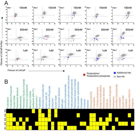 High-throughput drug library screen identified potential lead compounds that selectively inhibits proliferation MYCN overexpressing cells. (A) Scatter plot graphs show that fludarabine/fludarabine phosphate is a lead compound eliminating MYCN overexpressing cells. FDA-approved drug library compounds were applied at three different concentrations: 100 nM top panel, 500 nM middle panel, and 1 mM bottom panel to LNCap (x-axis) and LNCap-N-Myc (y-axis) cells and the cells were monitored for five days using high content imaging. Fludarabine/fludarabine phosphate red dots, additional hits blue dots, and non-hit grey dots. (B) Heatmap plot shows fludarabine and fludarabine phosphate exhibit preferential inhibition of LNCap-N-Myc cells at 100 nM, 500 nM, and 1 mM concentrations over five days (D1, D2, D3, D4, and D5). Yellow squares represent the days, where significant differences were identified. Hits in green text at 100 nM, hits in blue text at 500 nM, and hits in orange text at 1 mM (p < 0.05).