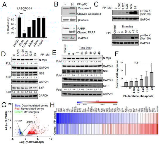 Fludarabine phosphate affects MYC protein levels and MYC transcriptional targets in NEPC cells. (A) Confluency measurements of LASCPC-01 cells following treatment of fludarabine phosphate 112 h after seeding (*** p < 0.001). (B) Fludarabine phosphate treatment induces apoptosis in LASCPC-01 cells at 25 μM. Western blot shows Figure 3 and PARP. b tubulin is used as a loading control. (C) Fludarabine phosphate causes DNA damage. Western blots show an increase in H2A.X in a dose-and-time-dependent manner in LASCPC-01 cells. Cells were treated with 25 μM fludarabine phosphate in the time course experiment. (D) Western blot shows a concentration-dependent decrease in N-MYC in fludarabine phosphate-treated LASCPC-01 cells. Cells were treated with DMSO or indicated concentrations of fludarabine phosphate for 48 h. Whole-cell extracts were subjected to Western blot analysis for N-MYC, NSE, and SYP. ImageLab software was used to quantify the bands with corresponding GAPDH and represented in the above blots. (E) Western blot shows time course analysis of N-Myc, NSE, and SYP levels at 48 h of 25 μM fludarabine phosphate treatment compared to the DMSO control at 48 h. (F) The e pression level of MYCN by RT-PCR in fludarabine phosphate-treated LASCPC-01 cells. Cells were treated with DMSO or indicated concentrations of fludarabine phosphate for 48 h. n.s not significant. (G) Volcano plot showing fold change in gene expression between fludarabine phosphate treated with 25 μM and untreated LASCPC-01 cells and their corresponding p-values at 48 h. (H) RNAseq expression analysis shows that 64 MYC-target genes were downregulated upon treatment with fludarabine phosphate in LASCPC-01 cells at 48 h compared to the DMSO-treated control.