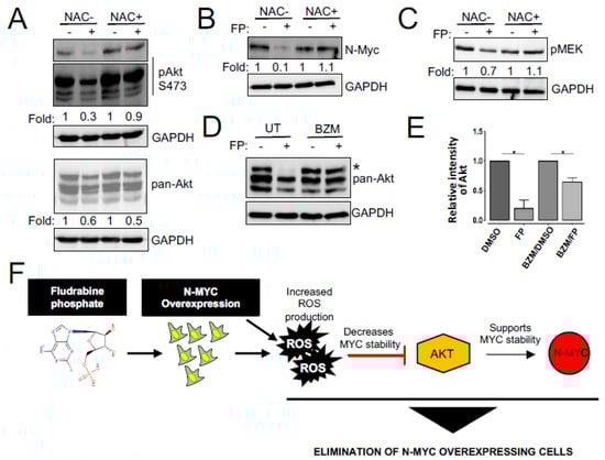 We next investigated the mechanism responsible for the effect of fludarabine phosphate on N-MYC protein levels. Previous studies have demonstrated that N-MYC degradation is negatively regulated by PI3K/AKT and Raf/MEK pathways [30,31] and that fludarabine phosphate may also affect AKT levels in an ROS-dependent fashion [63]. Therefore, we monitored phospho-AKT and phospho-MEK levels in fludarabine phosphate-treated NEPC cells. In line with previously published observations, we found total and phospho-AKT levels decreased upon fludarabine phosphate application, while treatment with the free-radical scavenger, N-acetyl-L-cysteine (NAC) preserved phospho-AKT, which is responsible for active signaling (Figure 4A). This indicates that the effect of fludarabine phosphate on AKT signaling is dependent on ROS production and in agreement, while we observed a decrease in N-MYC protein level when the LASCPC-01 cells were treated with fludarabine phosphate, N-MYC was stabilized in the presence of NAC (Figure 4B). Interestingly, fludarabine phosphate treatment did not cause any major impact on phospho-MEK levels (Figure 4C). While dual blocking of PI3K and MEK pathways is toxic to most cells, including normal tissue, we found that fludarabine phosphate treatment mainly affected the AKT pathway in an ROS-dependent fashion. Thus, the effect of fludarabine phosphate on N-MYC protein downregulation is most likely dependent on the inhibition of the PI3K/AKT pathway. To examine if fludarabine phosphate triggered AKT degradation via the proteasome, we monitored AKT protein levels in cells treated with fludarabine phosphate in the presence and absence of the proteasome inhibitor, bortezomib (BZM). These experiments showed that bortezomib treatment prevented AKT degradation and preserved its levels (Figure 4D,E). In summary, the effects of fludarabine phosphate on AKT and N-MYC appeared to be a consequence of increased ROS, and this is likely to provide a treatment advantage (Figure 4F).