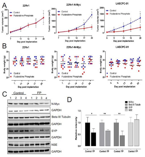 While our investigation has identified fludarabine phosphate as a potential FDA-approved drug that can preferentially inhibit N-MYC overexpressing cells in vitro, we next examined if its application in xenograft models will reduce tumor growth. To test this, subcutaneous xenograft tumors were generated in experimental animals by injecting LASCPC-01 cells in immunodeficient male NOD.Cg-Prkdcscid Il2rgtm1Wjl/SzJ (NOD-SCID) mice (Supp. Figure S3A). In addition, to eliminate cell line specific effects, we also used an independent, previously described isogenic model 22Rv1-Parental (22-P) and 22Rv1-N-Myc-overexpressing (22-Myc), where the differential expression of N-MYC has been previously shown to develop poorly differentiated, invasive prostate cancer that is molecularly similar to human NEPC [13]. Treatment of these animals with fludarabine phosphate was initiated when tumors reached a detectable size. Fludarabine phosphate or DMSO was administered through intraperitoneal (i.p.) injections at the dose of 120 mg/kg per injection, as previously described [64]. This dosage was selected based on the dosage used in multiple previous publications [64,65,66,67]. A total of 10 i.p. injections were given per mouse (one injection per day for five days) followed by two days of rest and then, continued as one injection per day again for another five days, as previously reported [64], and the animals were monitored for 20 days (Supp. Figure S3A). This experiment revealed that matching our tissue culture observations, treatment with fludarabine phosphate, selectively suppressed the growth of N-MYC overexpressing prostate cancer tumors (Figure 5A). The treated and control mice were also monitored for body weight and no adverse effects, such as a decrease of more than 10% in body weight, were encountered (Figure 5B). Tumor samples were subjected to Western blot analyses and tumor sections were stained with antibodies for neuroendocrine markers. Interestingly, consistent with in vitro studies, decreased MYC protein levels were observed in tumors treated with fludarabine phosphate (Figure 5C,D). In addition, these analyses also showed a decrease in SYP and β-tubulin III levels in Western blots alone (Figure 5C,D), but no major reduction in neuronal markers was observed by immunohistochemistry (Supp. Figure S3B) probably because of the lower sensitivity of this assay. Taken together, our findings demonstrate that fludarabine phosphate reduces N-MYC protein levels in NEPC cells in vivo and selectively suppresses MYCN-overexpressing tumors.