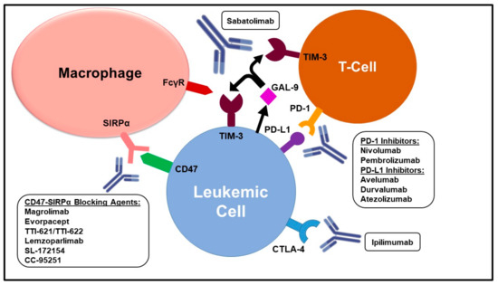 Sabatolimab, a novel anti-TIM-3 monoclonal antibody, has been found to exert its antileukemic activity through multiple mechanisms, including (1) direct targeting of TIM-3 of the surface of LSC and blasts, (2) blocking TIM-3/galaectin-9 interaction thereby preventing LSC self-renewal, and (3) promoting antibody-dependent cellular phagocytosis of LSC and blasts via binding to both TIM-3 on the surface of LSC/blasts and Fc gamma receptors on the surface of macrophages [95].