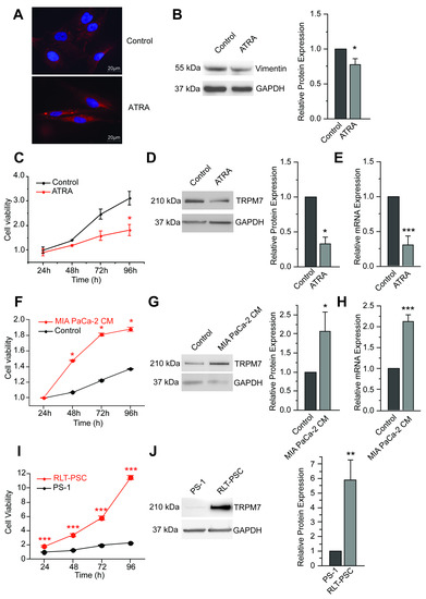 All-trans retinoic acid (ATRA) has previously been shown to induce quiescence in PSC cells, notably increasing fat-containing droplets and reducing cell viability [37]. In PS-1 cells (isolated from a normal pancreas [29]), more lipid droplets were indeed detected using Nile red dye (1:1000 for a minimal of 30 min) following ATRA treatment (Figure 1A). At the molecular level, ATRA was found to decrease the expression of vimentin (Figure 1B), as previously reported [38]. PS-1 cell viability was also decreased after ATRA treatment (Figure 1C). In these more quiescent stellate cells, TRPM7 protein expression was found to be reduced (Figure 1D), and this reduction was confirmed at the mRNA level (Figure 1E). We then tried to activate PS-1 cells by exposing them to MIA-PACA-2 cancer-cell-conditioned medium. With this latter treatment, cell viability was significantly increased (Figure 1F). Most importantly, TRPM7 protein expression level was increased by a factor of 2 (Figure 1G), and this increase was also seen at the mRNA level (Figure 1H). We then wondered whether TRPM7 could be actually a marker of human pancreatic stellate cell activation by measuring expression levels in another pancreatic stellate cell line, named RLT-PSC, isolated from patients with chronic pancreatitis [30]. In these activated PSC, cell viability was found largely increased when compared with PS-1 cells (Figure 1I). In this chronic pancreatitis model, expression of TRPM7 was also increased at the protein level (Figure 1J).