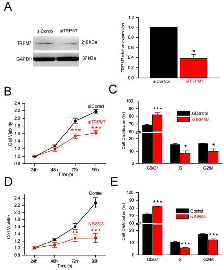 Proliferation was influenced by TRPM7 expression. (A) Immunoblotting of lysates of PS-1 cells transfected with a scramble siRNA (siControl) or a siRNA targeting TRPM7 (siTRPM7), and incubated with anti-TRPM7 antibody (n = 4). * indicates p < 0.05 (Mann–Whitney Rank Sum Test). (B) PSC viability was decreased at 72 h and 96 h following TRPM7 silencing (n = 4). *** indicates p < 0.001 (2-ways ANOVA). (C) TRPM7 silencing led to enrichment of cells in G0/G1 while decreasing the percentages of cells in S and in G2/M phases of the cell cycle (n = 3). * indicates p < 0.05 and *** indicates p < 0.001 (2-ways ANOVA). (D) The pharmacological blocker of TRPM7 channels, NS8593 (25 µM), decreased PS-1 cell viability at 72 and 96 h (n = 3). ** indicates p < 0.01 and *** indicates p < 0.001 (2-ways ANOVA). (E) Following NS8593 treatment, PS-1 cells accumulated in G0/G1 phase, whereas the percentage of cells decreased in S and in G2/M phases (n = 3). *** indicates p < 0.001 (2-ways ANOVA).