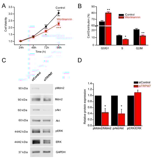 We next wondered how TRPM7 was able to influence proliferation. It has been shown that TRPM7 regulates hepatic stellate cell proliferation through the PI3K and ERK pathways [42]. To study the involvement of the PI3K pathway in PS-1 cell proliferation, 24 h treatment with wortmannin (1 µM) was first used to selectively inhibit PI3K. Wortmannin was actually found to inhibit PS-1 cell viability at 72 and 96 h (Figure 4A). Wortmannin treatment induced the accumulation of cells in G0/G1 phase of the cell cycle and decreased the proportion of cells in S and G2/M phases (Figure 4B). Next, we sought to determine whether TRPM7 inhibition had any effect on PI3K pathway. Interestingly, the pAkt/Akt and the pMdm2/Mdm2 ratios were decreased by TRPM7 silencing (Figure 4C,D). On the other hand, TRPM7 silencing was not able to modify the pERK/ERK ratio in PS-1 cells (Figure 4C,D). Collectively, our data demonstrated that PI3K was implicated in PS-1 cell proliferation, and that TRPM7 inhibition was able to affect the PI3K/Akt pathway but not ERK pathway.