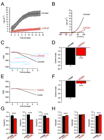 TRPM7 is active and regulates cytosolic Mg2+ homeostasis in PSCs. (A) Development of an outward Magnesium-Inhibited Cation (MIC) current recorded at +100 mV during the dialysis of intracellular media by a 0-Mg intrapipette solution in PSCs transfected by a control siRNA (n = 6) and in PSCs transfected by a siRNA targeting TRPM7 (n = 4). (B) MIC currents are decreased in PSCs treated by a TRPM7 siRNA (n = 4) compared to cells treated by a control siRNA (n = 6). * indicates p < 0.05 (Mann–Whitney Rank Sum Test for the current-densities recorded at +100 mV). (C) Estimation of constitutive divalent cation entry by Mn2+-quenching in PSCs treated by a TRPM7 siRNA (n = 19) compared to control cells (n = 23). (D) Quantification of constitutive divalent cation entry after TRPM7 silencing. *** indicates p < 0.001 (t-test). (E) Estimation of constitutive divalent cation entry by Mn2+-quenching in PSCs treated by NS8593 (n = 34) compared to control cells (n = 30). (F) Quantification of constitutive divalent cation entry after TRPM7 block. *** indicates p < 0.001 (t-test). (G) Quantification of MagFura-2 fluorescence ratio after treatment with siTRPM7 (n = 87 for siTRPM7 and n = 92 for siControl), after treatment with NS8593 (n = 32 for treated cells and n = 39 for control), and after treatment with ATRA (n = 40 for treated cells and n = 32 for control). *** indicates p < 0.001 (t-tests). (H) Quantification of Fura-2 fluorescence ratio after treatment with siTRPM7 (n = 47 for siTRPM7 and n = 36 for siControl), after treatment with NS8593 (n = 23 for treated cells and n = 34 for control), and after treatment with ATRA (n = 52 for treated cells and n = 27 for control). *** indicates p < 0.001 (t-tests).