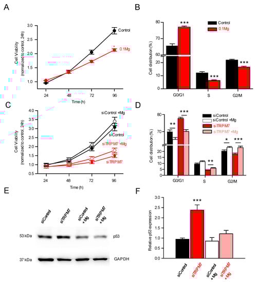 These results suggest that magnesium was, by far, the best candidate to explain the physiological effects observed in PSCs. In good agreement with this, deprivation of Mg2+ in the culture media induced a decrease in cell viability (Figure 6A) associated with an accumulation in the G0/G1 phase and a decrease in cell numbers in S and G2/M phases (Figure 6B). Mg2+ deprivation induced similar effects than TRPM7 inhibition or ATRA treatment. Conversely, Mg2+ supplementation reversed the effect of TRPM7 silencing on cell cycle (Figure 6D), although the effect on cell viability was modest (p < 0.07; Figure 6C). Moreover, Mg2+ supplementation reversed the effect of TRPM7 silencing on p53 expression (Figure 6E,F).